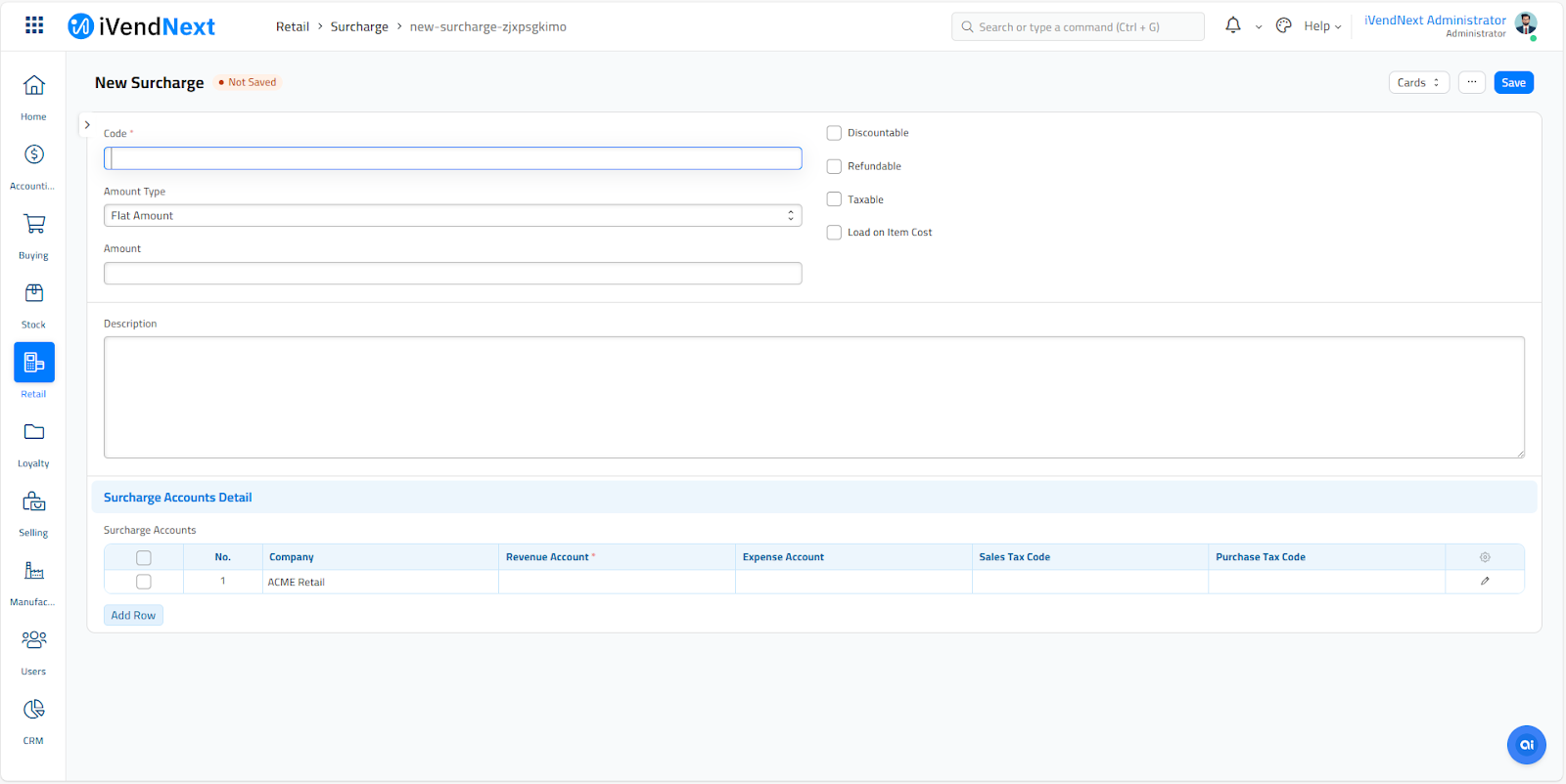 Click on the Add Row button displayed below the Surcharge Accounts section to add a new blank row. Click on the Pencil symbol under the Gear icon to open the Editing Row screen.